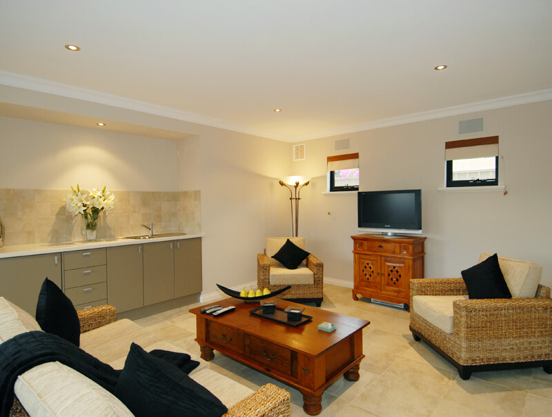Albeit a beach house, inclusions such as a raised spa bath, bar area and kitchenette abutting the home theatre can only enhance the holiday lifestyle.