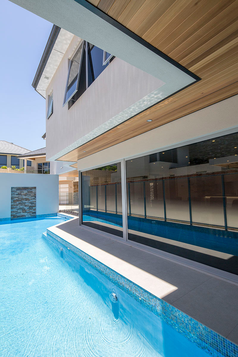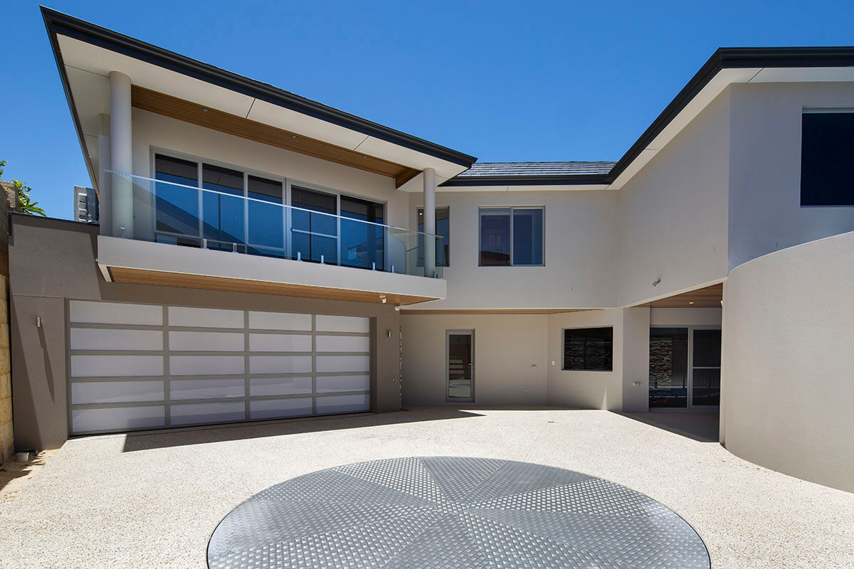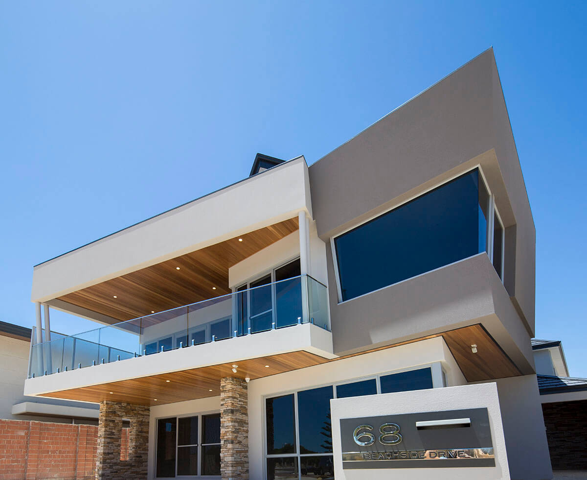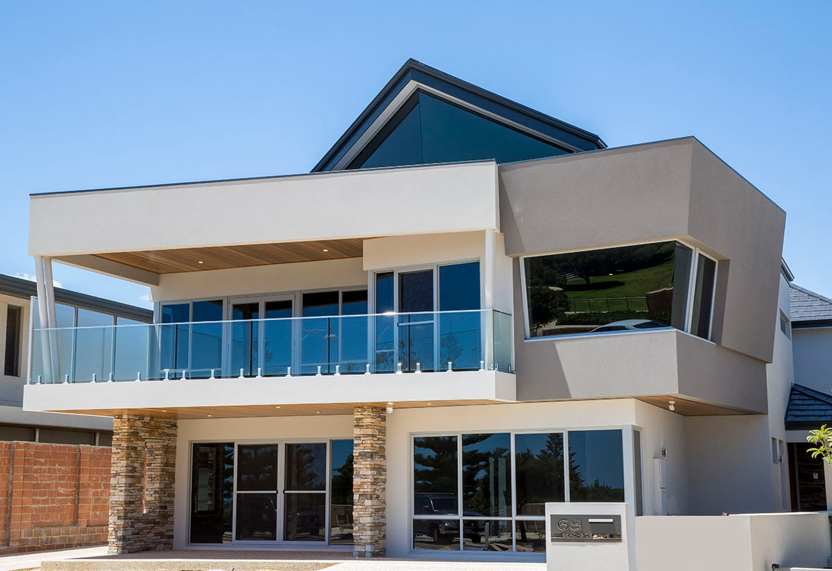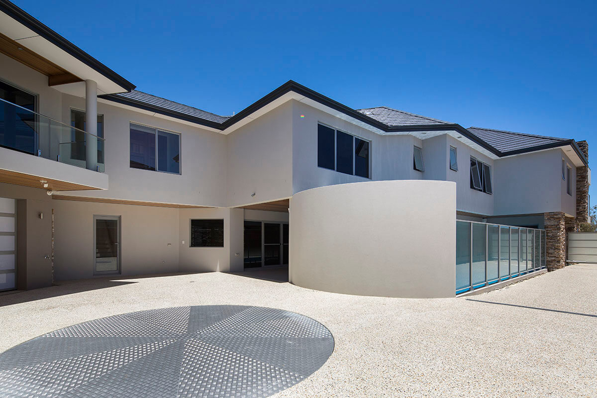 A striking angular design creates the perfect contemporary beach house for this Burns Beach site. Standing out amongst neighbouring properties, the façade beautifully combines contrasting light and dark render with extensive glazing. Feature stone cladding and timber lining on balconies and eaves add an organic quality and classic appeal to the modern design.