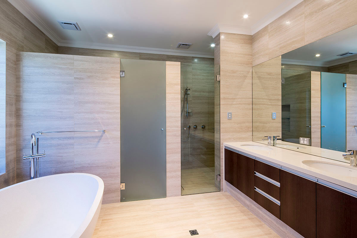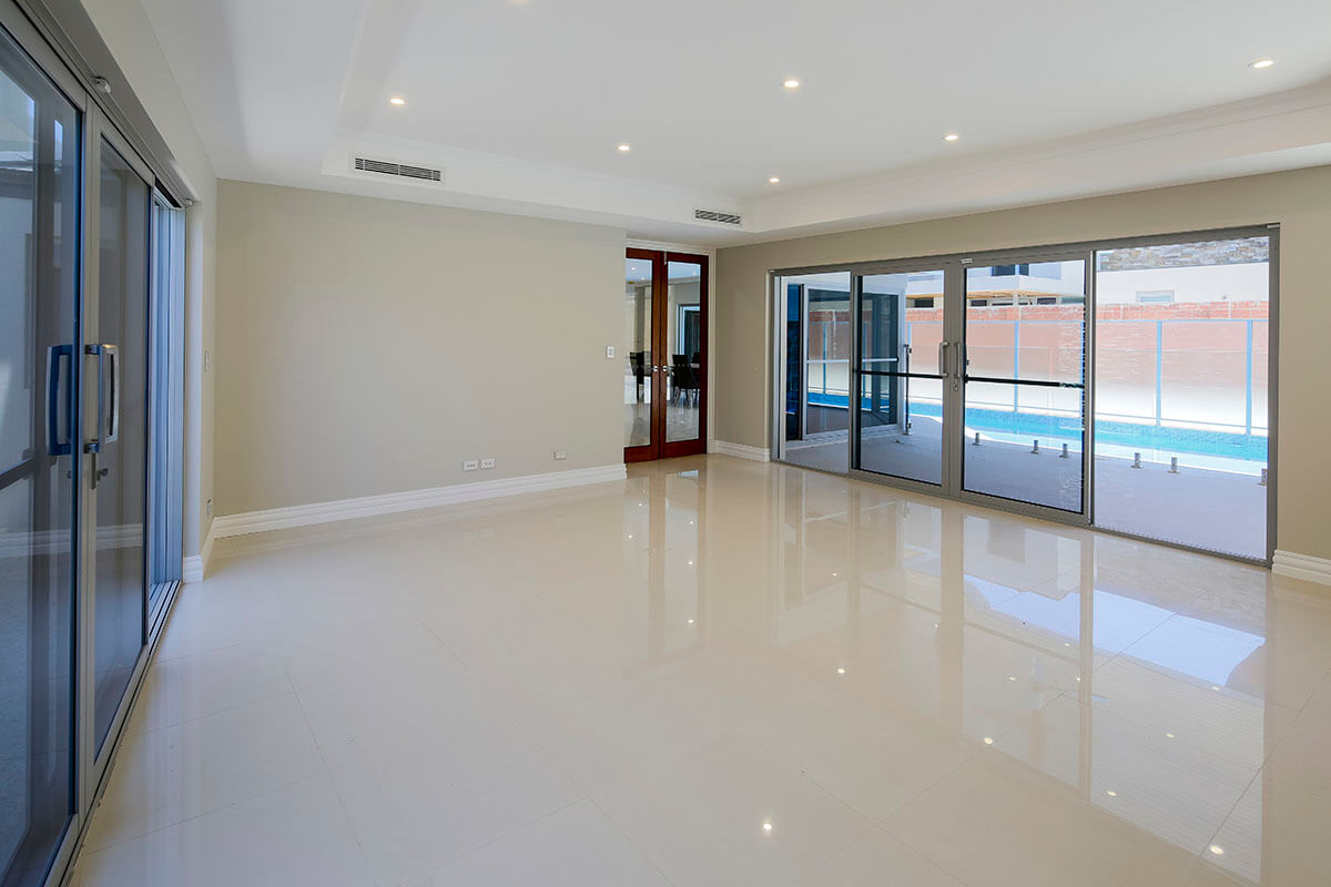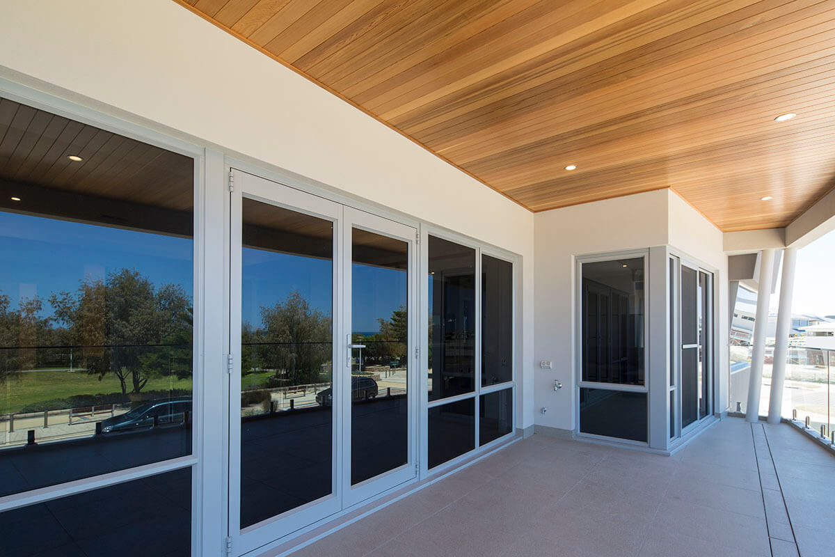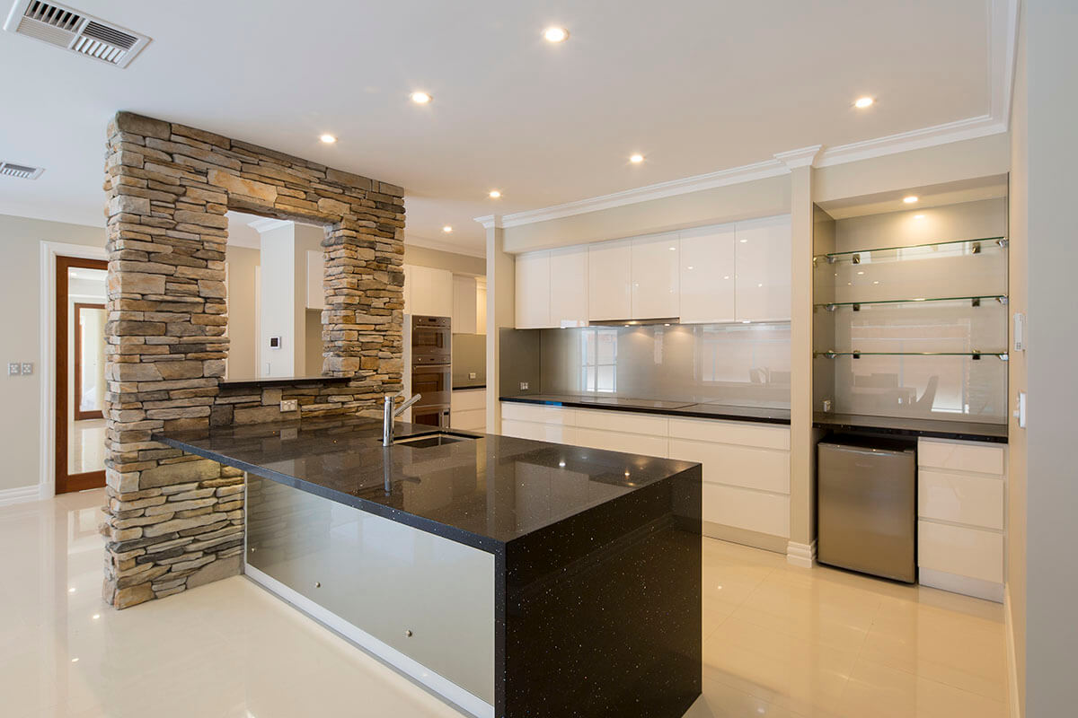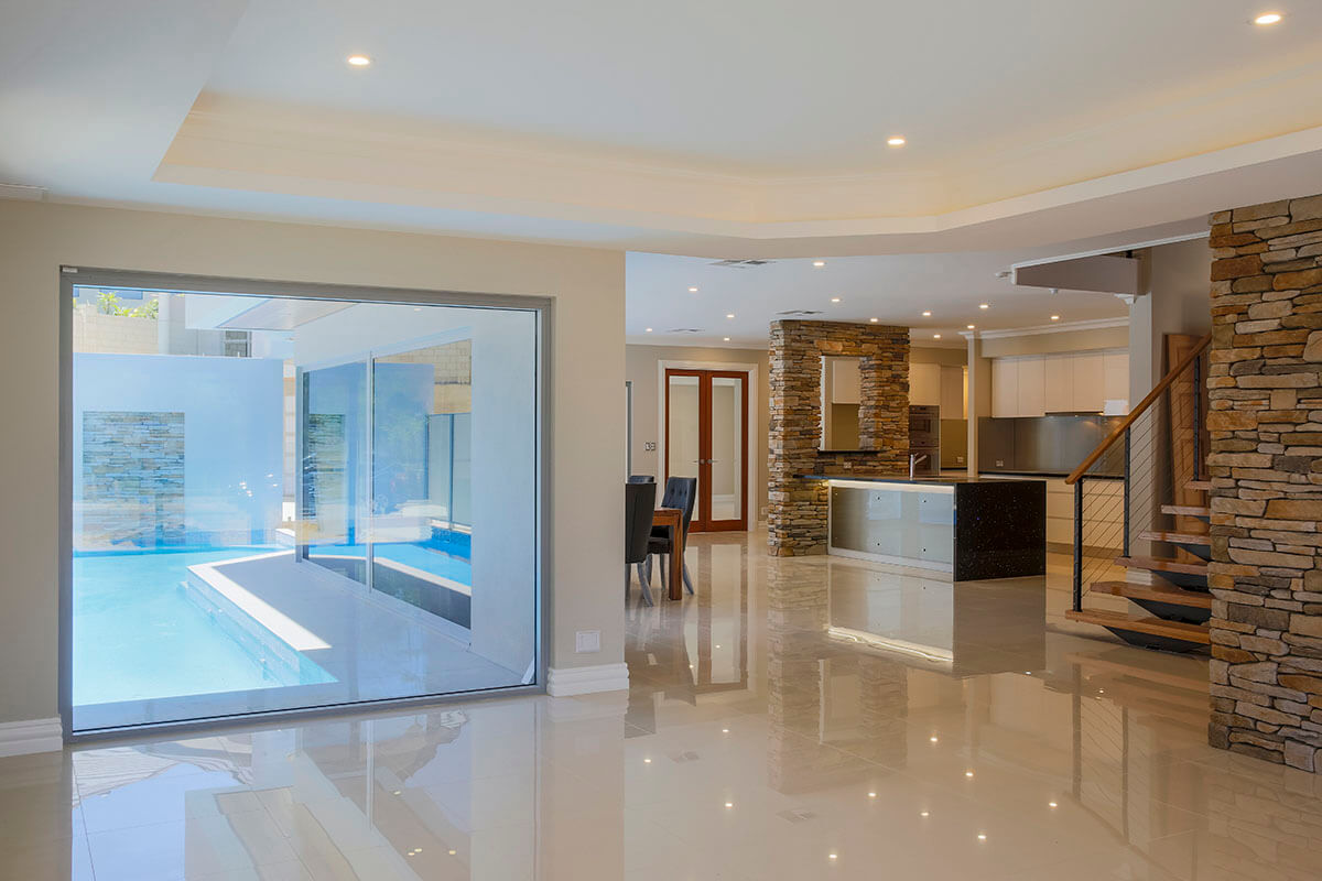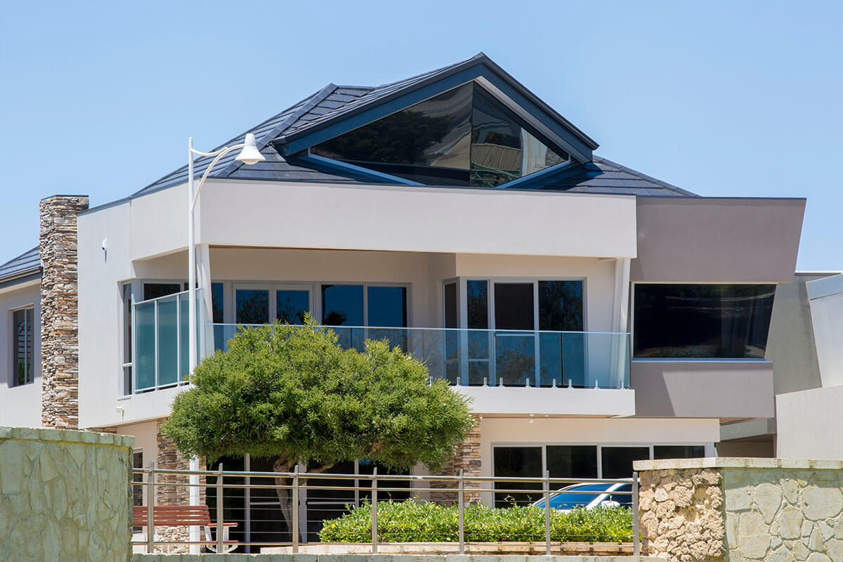A striking angular design creates the perfect contemporary beach house for this Burns Beach site. Standing out amongst neighbouring properties, the façade beautifully combines contrasting light and dark render with extensive glazing. Feature stone cladding and timber lining on balconies and eaves add an organic quality and classic appeal to the modern design.