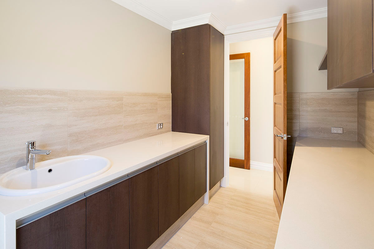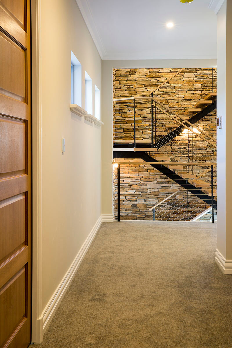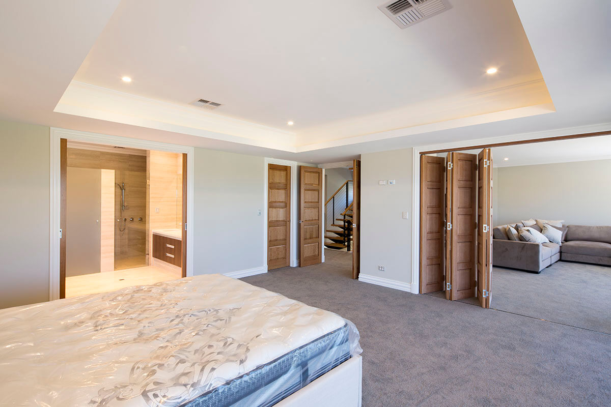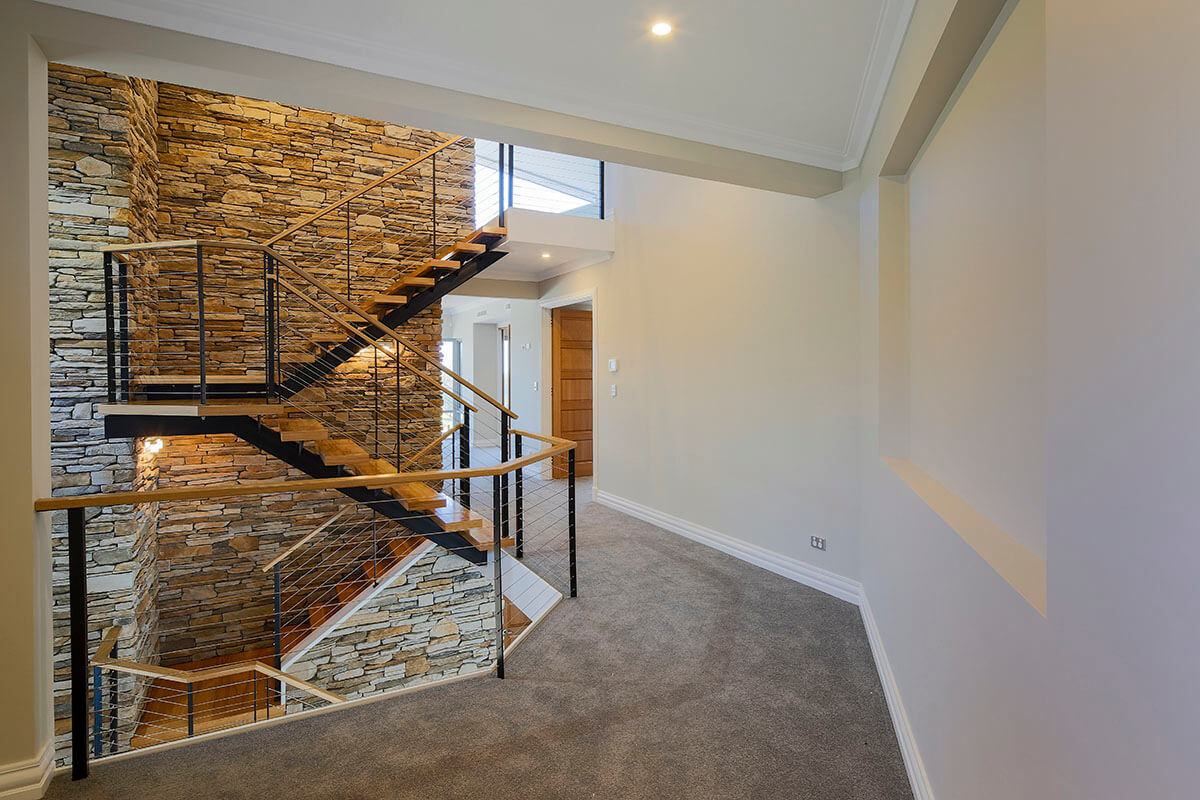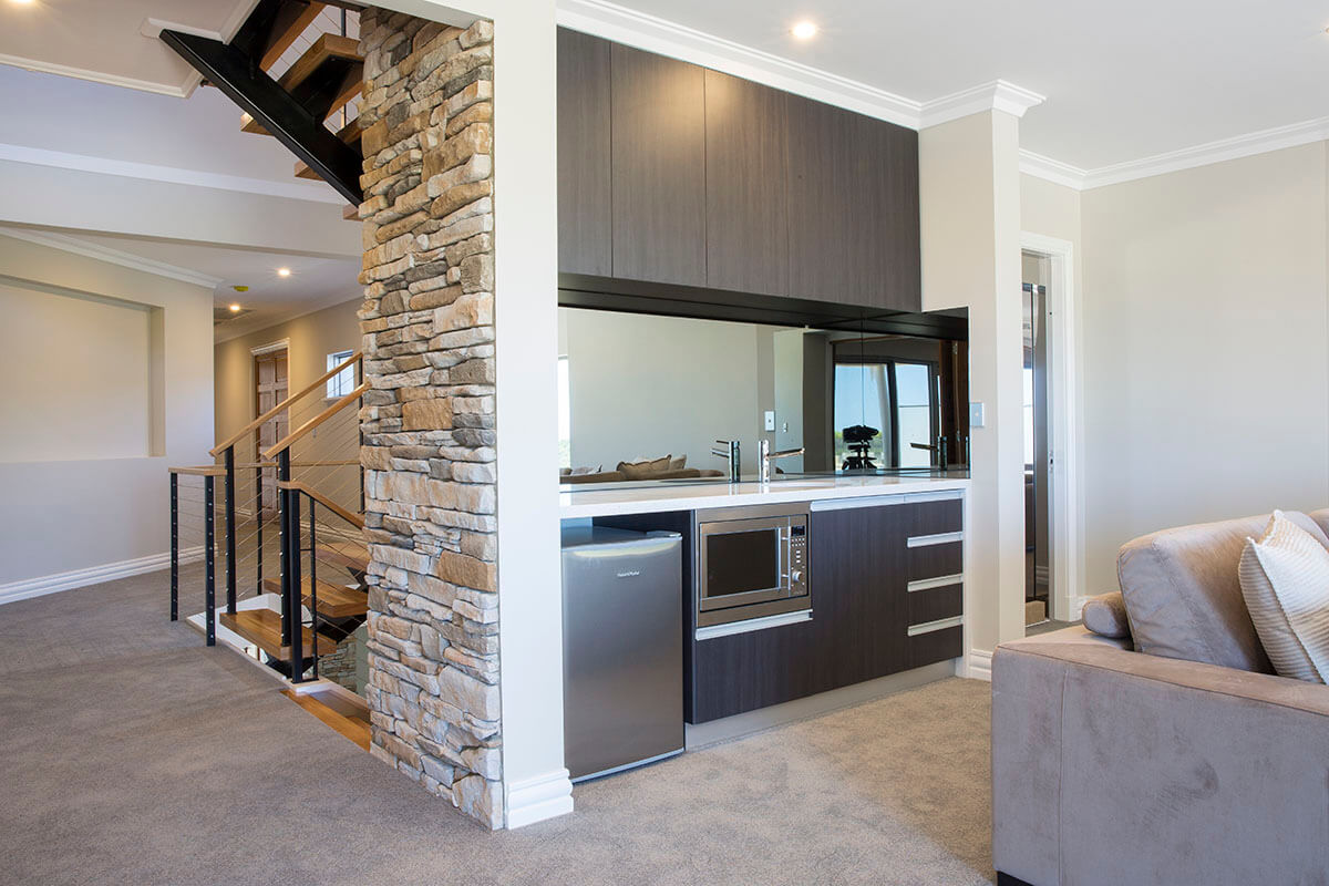 Creating cohesiveness in design between the interior and exterior, feature stone cladding has also been introduced to the internal spaces, including a stunning feature wall that extends all three levels of the home supporting a gorgeous timber tread staircase. Finished with the exceptional attention to detail that is evident in every Artique home another highlight of this residence is the master suite. Already expansive in size, the master bedroom fully opens via bi-folding doors to a sitting room with its own kitchenette, and with a luxurious en-suite that includes floor to ceiling tiling and a free-standing bath, this luxurious space becomes the ultimate parents’ retreat.