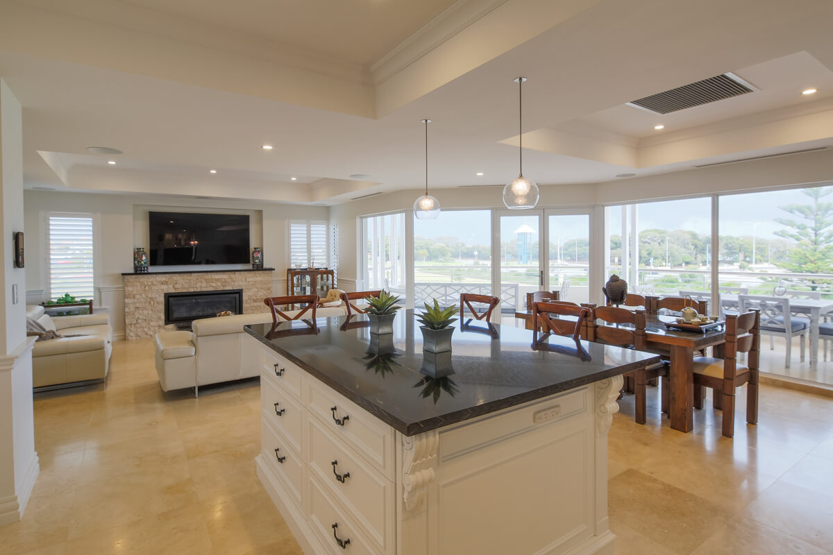 Finished throughout with meticulous attention to detail, the quality of this home is evident from the moment you step through the front door. The open-plan living space, characterised by high ceilings, stone flooring, and a prominent stone fireplace, establishes the breezy coastal atmosphere inside. Finished in classic black and white, the beautifully crafted kitchen features traditional styling with custom-joinery, a free-standing oven and black stone benchtops and splashbacks.