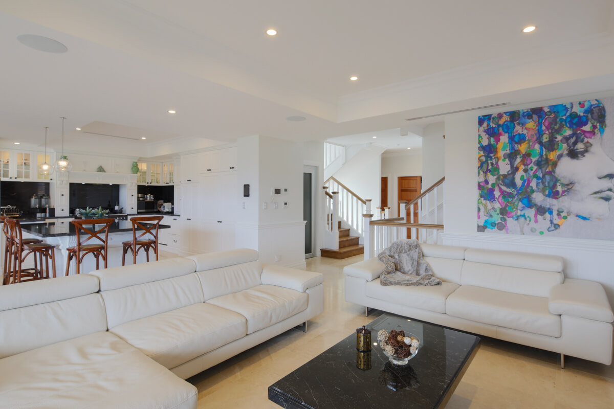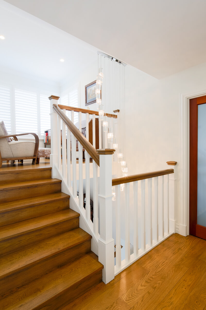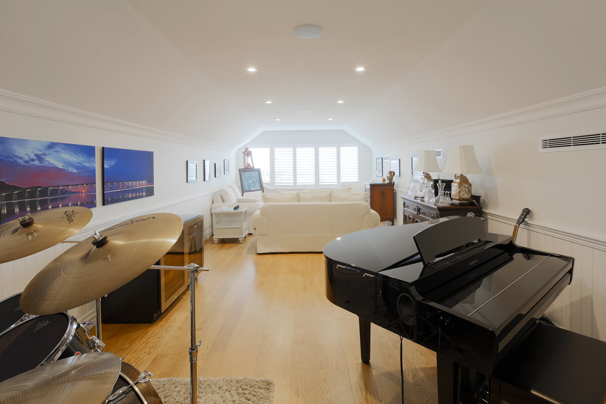 The unique floorplan incorporates a tower with two internal levels, ensuring all of the client’s desires could be accommodated, including a luxurious master-suite, music room, loft, theatre room, minor bedrooms, activity room, and study, all connected by a central lift and a timber staircase with white polished timber handrails and white painted post balustrading.