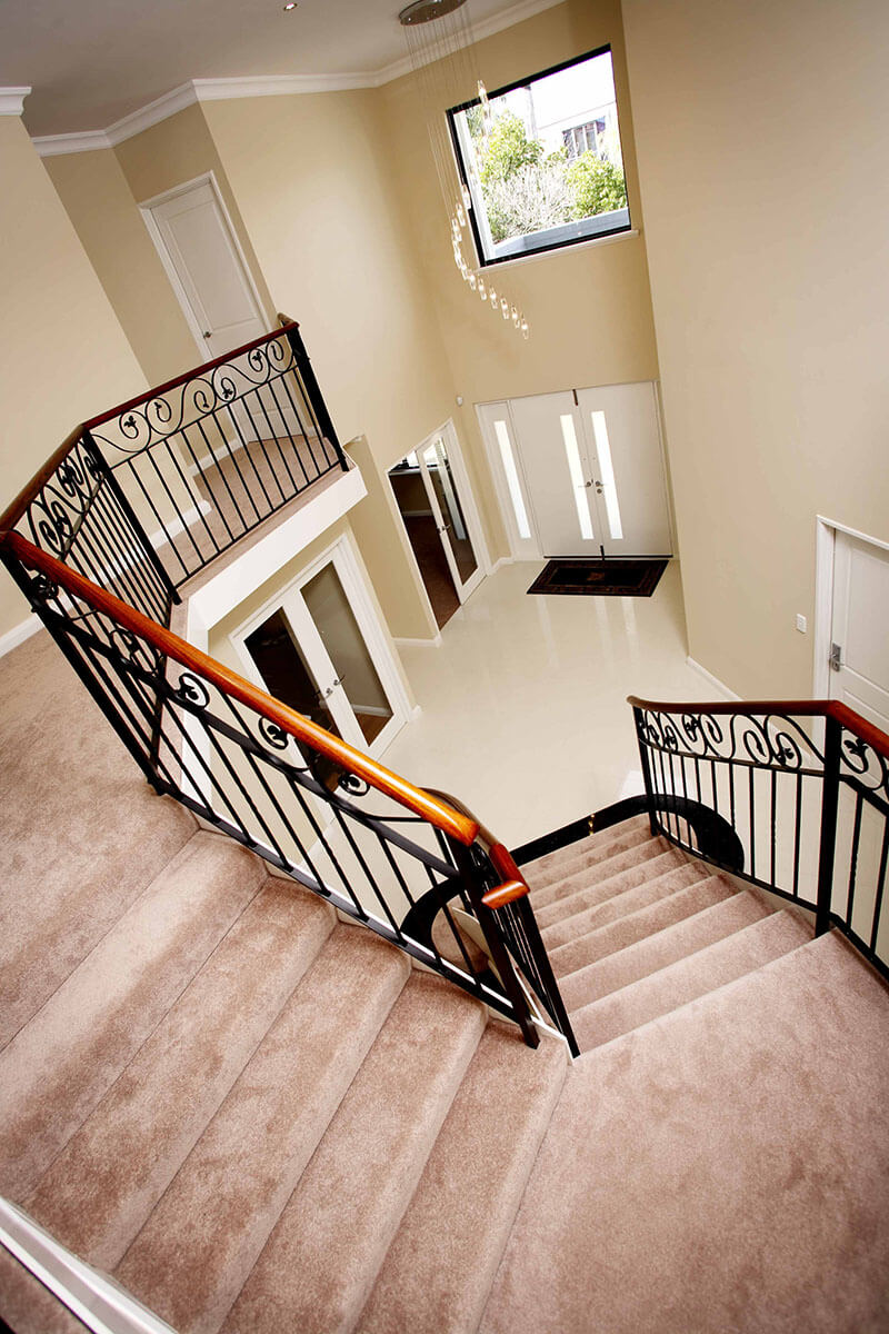Walking through the double entry doors into the home’s foyer, you’re immediately struck by a sense of space. This has been emphasised through soaring ceilings that have been created thanks to an upper-level void which accommodates a sweeping staircase with custom wrought iron balustrading and polished timber rails.